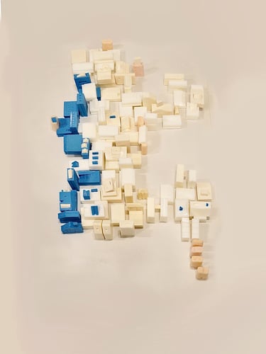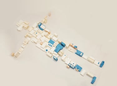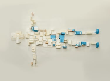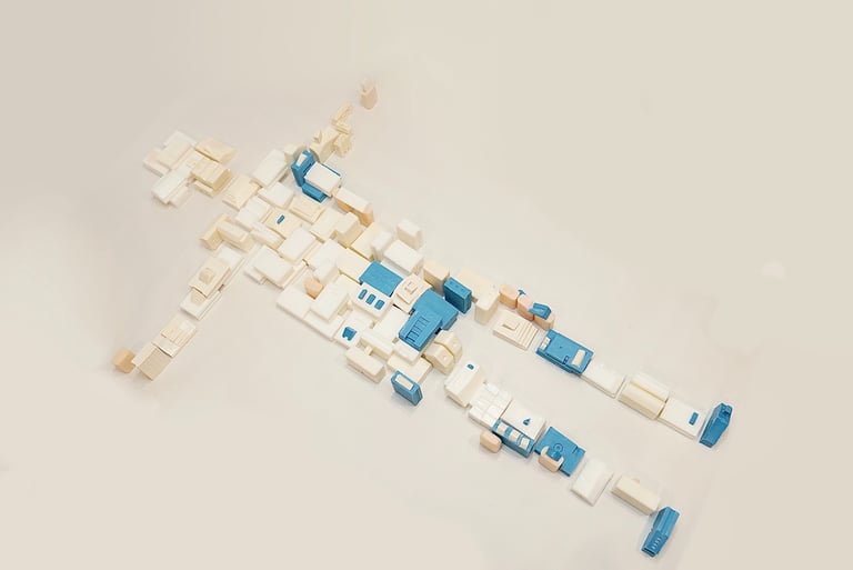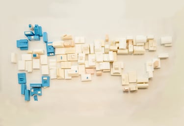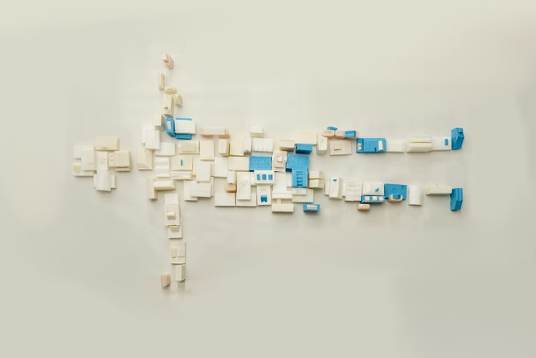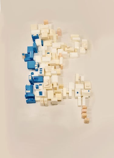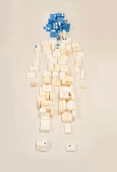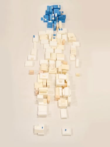 부모님 가게에서 사용되고 버려지는 폐기름을 이용해 비누를 만들고 그 비누들을 집 모양을 조각하고 그 집들로 쉬는 사람의 모양을 만들었다. 파란 비누는 내가 마주한 통증의 자리를 의미한다. spine, semi spine, side lying 자세에서 어떤 사건으로부터 오늘의 통증이 또 쌓였는지 관찰한다.